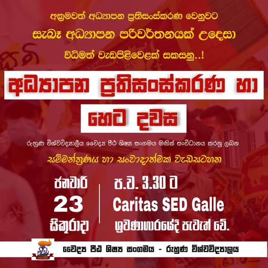 උණුසුම් පුවත්කාලීනසාහිත්යය හා කලාව අධ්යාපන ප්රතිසංස්කරණ හා හෙට දවස 2026-01-210 සම්මන්ත්රණය හා සංවාදාත්මක වැඩ සටහන - රුහුණු වෛද්ය පීඨයේ මෙහෙයවීමෙන් අක්රමවත් අධ්යාපන ප්රතිසංස්කරණ වෙනුවට සැබෑ අධ්යාපන පරිවර්තනයක් උදෙසා විධිමත් වැඩපිළිවෙළක් සකසනු..! Share on Facebook Share Share on TwitterTweet Share on LinkedIn Share Post navigation Previous Article මාර්ටින් වික්රමසිංහ සූරින්ට අපහාස කළ පාහර ටියුෂන් ගුරාට නීතිමය පියවර Next Article ආණ්ඩුව 6 ශ්රේණියේ සිසුන්ට අසභ්යකරණය උගන්වන්න හදනවා