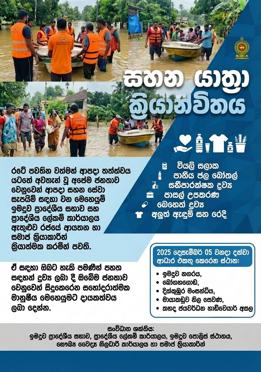 ආර්ථිකඋණුසුම් පුවත්කාලීනසංස්කෘතික ඉමදූවෙන් සහන යාත්රා ඇරඹේ 2025-11-300 Share on Facebook Share Share on TwitterTweet Share on LinkedIn Share Post navigation Previous Article එක්සිත් ව එක්වෙමු! Next Article සුළි කුණාටුවේ සෘජු බලපෑම ඉවත් වුවද තවමත් එහි වක්ර බලපෑම පවතිනවා