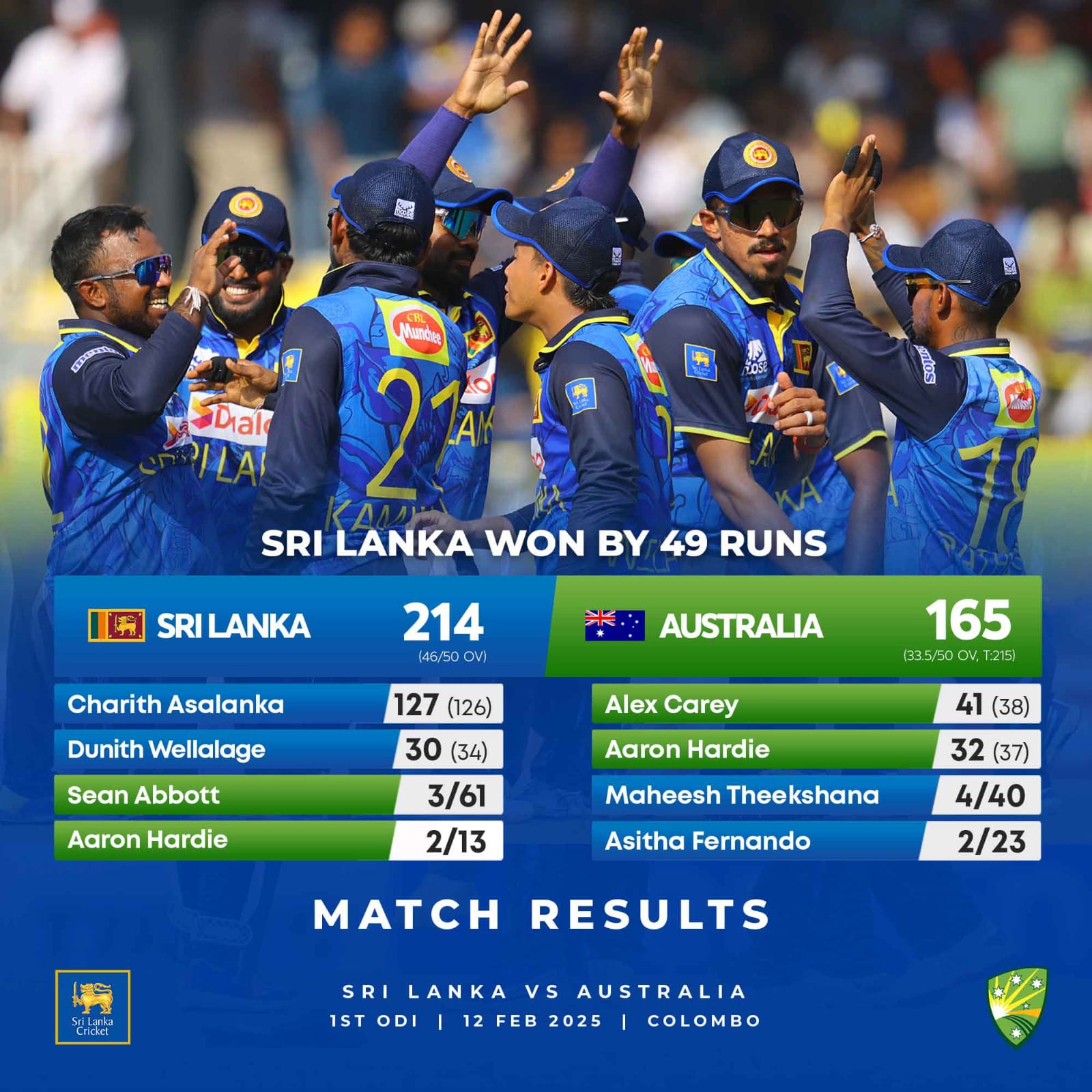 ඕස්ට්‍රේලියාවට එරෙහි පළමු එක්දින ක්‍රිකට් තරගයෙන් ශ්‍රී ලංකාව ලකුණු 49 ක ජයක් ලැබීය. SL🇱🇰 214/10 ▪️චරිත් අසලංක 127.🔥 ෂේන් අබොට් 3/61 ඕස්ට්‍රේලියාව 165/10 ▪️ඇලෙක්ෂි කැරෙයි 41 ▪️මහේෂ් තීක්ෂණ 4/40