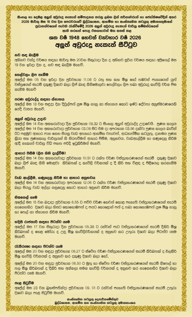 උණුසුම් පුවත්කාලීනවිශේෂාංගසංස්කෘතික ඔබ සැමට සුබ අලුත් අවුරුද්දක් වේවා! – හෙළදිව පුවත් සංග්රහය 2026-04-130 මිහිකත පිබිද දී දලු මල් තුරු හිසට පැහැපත අසිරි ඇස ඇස නිවමින් රුවට ඔබ වෙත ගෙනෙයි නව අවුරුදු ගී සුමට යහපත සැදේවා මව්බිම වැසි සැමට!!! - ගාමිණි සුමනසේකර Share on Facebook Share Share on TwitterTweet Share on LinkedIn Share Post navigation Previous Article සාහිත්ය ලොවේ ප්රමුඛයකු වන්න වෙහෙසෙන්න! Next Article සතුට බෙදා ගමු හැමදෙන පිළිගෙන