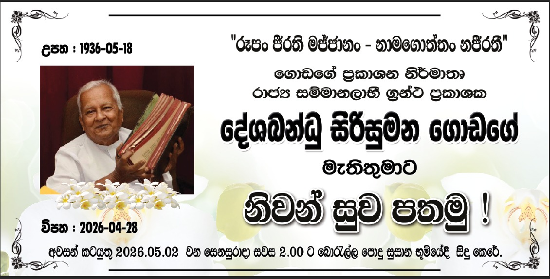උණුසුම් පුවත්කාලීනසංස්කෘතිකසාහිත්යය හා කලාව නික්ම යන සබඳ – ගොඩගේ මැති සඳ 2026-04-290 අවසන් කටයුතු සෙදුරාදා (2) පස්වරු 2. 00 ට බොරැල්ල කනත්තේ දී Share on Facebook Share Share on TwitterTweet Share on LinkedIn Share Post navigation Previous Article සිරිසුමනයෝ ද නික්ම ගියහ!