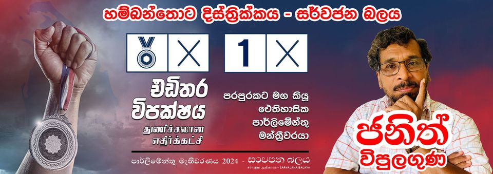 ජනිත් විපුලගුණ මහතා 2024 පාර්ලිමේන්තු මැතිවරණයට තරඟ කරන්නේ හම්බන්තොට දිස්ත්රික්කයේ ඡන්නදායකයින්ගෙන් ජනවරම් ලබාගෙන පාර්ලිමේන්තුව නියෝජනය කරමින් ගිරුවා පත්තුවේ පොදු මහජන අවශයතා ඉටු කිරීමේ අපේක්ෂාව ම පෙරදැරිව පමණක් නොවේ. ඊට එහා ගිය දේශපාලන දැක්මක් ඔහු සතු ය. හේ තරග වදින්නේ සුප්රකට ව්යවසායක දිලිත් ජයවීර මහතා නායකත්වය දෙන මව්බිම ජනතා පක්ෂය ප්රමුඛ වාමවාදී දේශපාලන පක්ෂ කිහිපයක එකතුවෙන් නිර්මාණය කෙරුණු සර්වජන බලය නම් සන්ධානයෙනි.