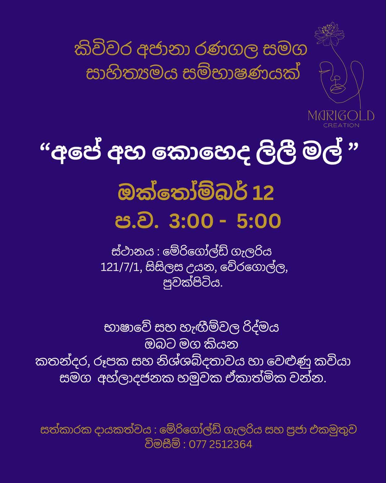 එන්න පුවක්පිටිය, වේරගොල්ල, සිසිලස උයනේ, 121/7/1 හි මේරිගෝල්ඩ් ගැලරිය වෙත...