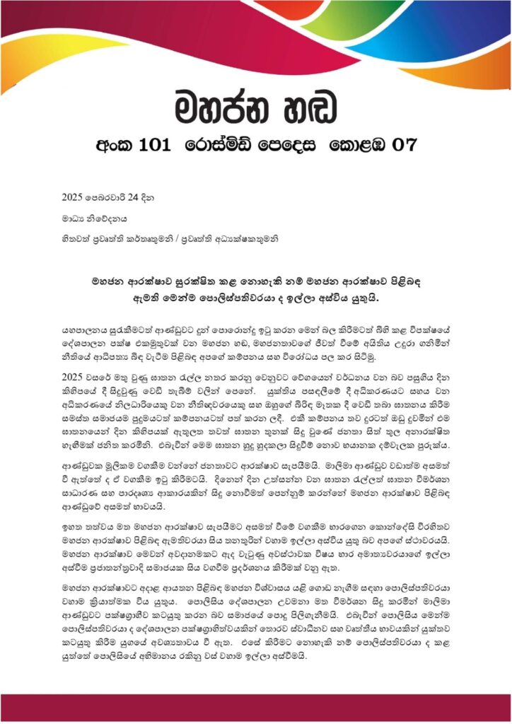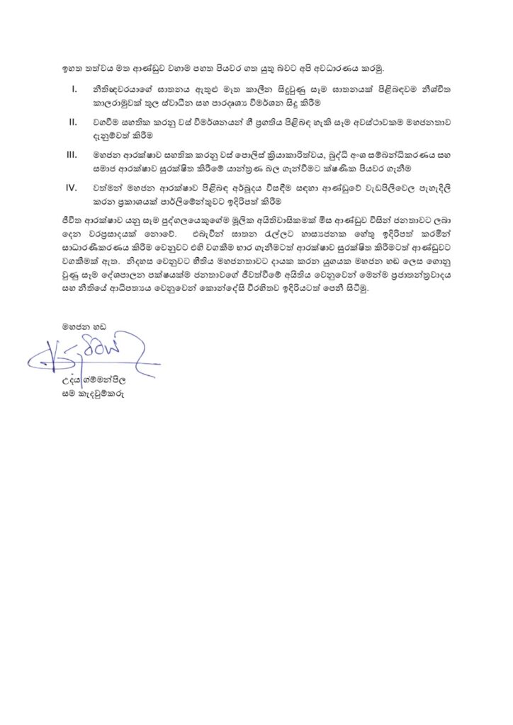ජීවිත ආරක්ෂාව යනු සෑම පුද්ගලයෙකුගේම, මූලික අයිතිවාසිකමක් මිස ආණ්ඩුව විසින්, ජනතාවට ලබා දෙන වරප්රසාදයක් නොවේ. එබැවින් ඝාතන රැල්ලට හාස්යජනක හේතු ඉදිරිපත් කරමින්, සාධාරණීකරණය කිරීම වෙනුවට, එහි වගකීම භාර ගැනීමටත්, ආරක්ෂාව සුරක්ෂිත කිරීමටත්, ආණ්ඩුවට වගකීමක් ඇත. නිදහස වෙනුවට භීතිය මහජනතාවට දායක කරන යුගයක, මහජන හඬ ලෙස ගොනු වුණු සෑම දේශපාලන පක්ෂයක් ම, ජනතාවගේ ජීවත්වීමේ අයිතිය වෙනුවෙන් මෙන් ම, ප්රජාතන්ත්රවාදය සහ නීතියේ ආධිපත්යය වෙනුවෙන් කොන්දේසි විරහිතව ඉදිරියටත් පෙනී සිටිමු.