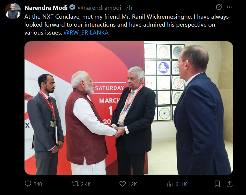 ” NXT සමුළුවේදී මගේ මිත්ර රනිල් වික්රමසිංහ මහතා හමු වුණා. අපගේ අන්තර්ක්රියා දෙස සැමවිටම බලා සිටින අතර විවිධ ගැටලු පිළිබඳව ඔහුගේ ඉදිරි දර්ශනය මම අගය කර ඇත්තෙමි” යනුවෙන් මෝදි පවසා ඇත්තේ ය.