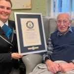 ජෝන් ටින්නිස්වුඩ් ලොව වයස්ගතම මිනිසා බව ප්රකාශ කළ ගිනස් ලෝක වාර්තාවේ සහතිකය සමඟ පෙනී සිටියි.
