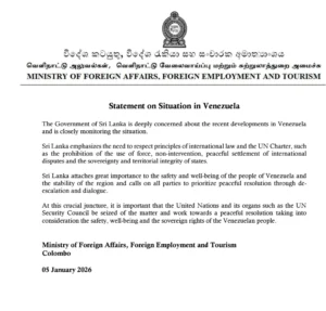 වෙනිසියුලාවේ පවතින තත්ත්වය ඉතා සමීපව නිරීක්ෂණය කරමින් සිටින බව විදේශ කටයුතු, විදේශ රැකියා සහ සංචාරක අමාත්යාංශය විසින් නිවේදනයක් නිකුත් කරමින් ප්රකාශ කරයි.