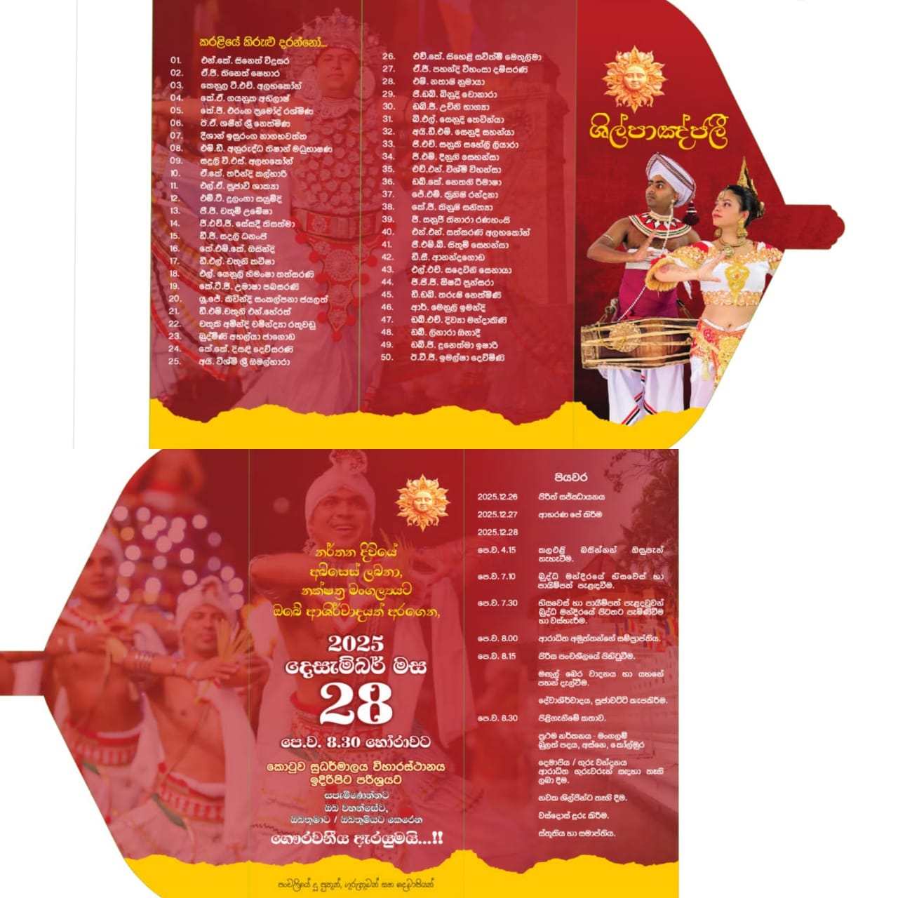 උණුසුම් පුවත්කාලීනසංස්කෘතිකසාහිත්යය හා කලාව ශිල්පාඤ්ජලී 2025-12-260 නර්තන දිවියේ අබිසස් ලබනා නක්ෂත්ර මංගල්යය ගාල්ල කොටුව සුධර්මාලය අබියස පරිශ්රයේ දී යොවුන් නර්තන ශිල්පී ශිල්පිණියන් 50 ක ගේ කලඑළි මංගල්යය දෙසැම්බර් 28 වැනිදා ගාල්ල කොටුවේ සුධර්මාලය විහාරස්ථානය ඉදිරිපිට පරිශ්රයේ දී පෙරවරු 8. 30 ඇරඹෙන වග යි. Share on Facebook Share Share on TwitterTweet Share on LinkedIn Share Post navigation Previous Article වියට්නාම තානාපතිනිය අපේ ජනමාධ්ය අමාත්යාංශයට ඇවිත් Next Article සුනාමි ඛේදවාචකයේ 21 වැනි සැමරුම