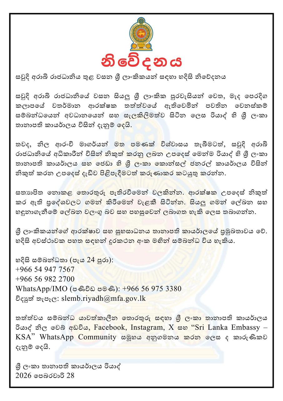 උණුසුම් පුවත්කාලීනපරිසරය සෞවුදියේ සිටින සියලු ශ්රී ලාංකීකයනට නිවේදනයක් 2026-03-010 Share on Facebook Share Share on TwitterTweet Share on LinkedIn Share Post navigation Previous Article මැදපෙරදිග ගමනාන්ත තාවකාලිකව අත්හිටුවීමට ශ්රීලංකන් තීරණය කරයි Next Article තෙල් තියෙනව ලු කලබල වෙන්නෙපා ලු