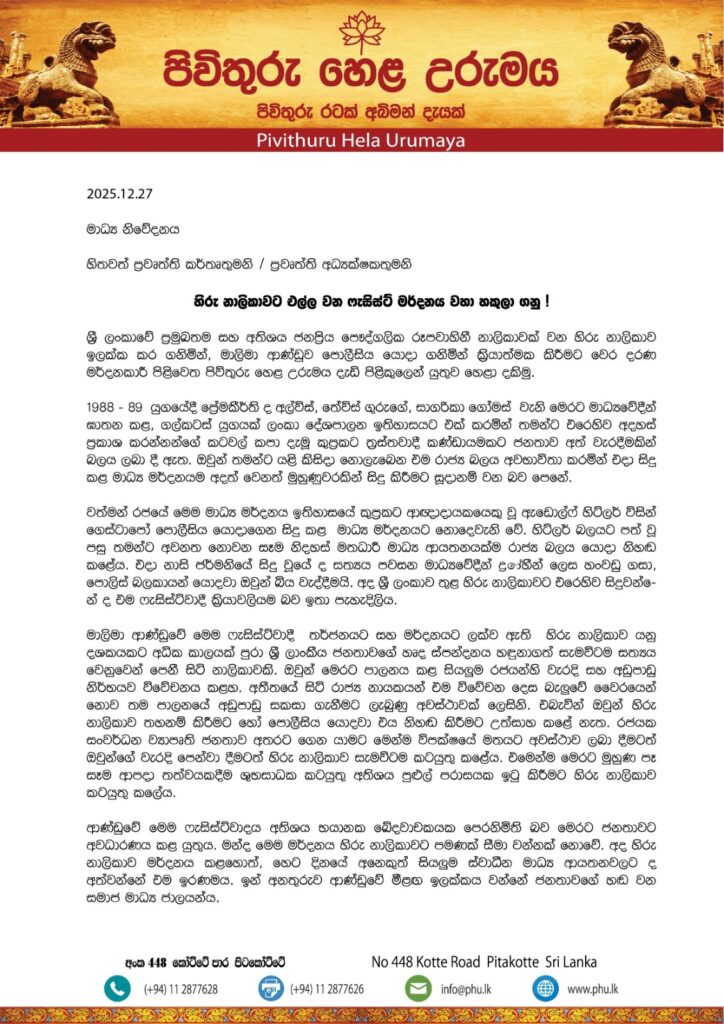 ශ්‍රී ලංකාවේ ප්‍රමුඛතම සහ අතිශය ජනප්‍රිය පෞද්ගලික රූපවාහිනී නාලිකාවක් වන හිරු නාලිකාව ඉලක්ක කර ගනිමින්, මාලිමා ආණ්ඩුව පොලීසිය යොදා ගනිමින් ක්‍රියාත්මක කිරීමට වෙර දරණ මර්දනකාරී පිළිවෙත පිවිතුරු හෙළ උරුමය දැඩි පිළිකුලෙන් යුතුව හෙළා දකිමු.