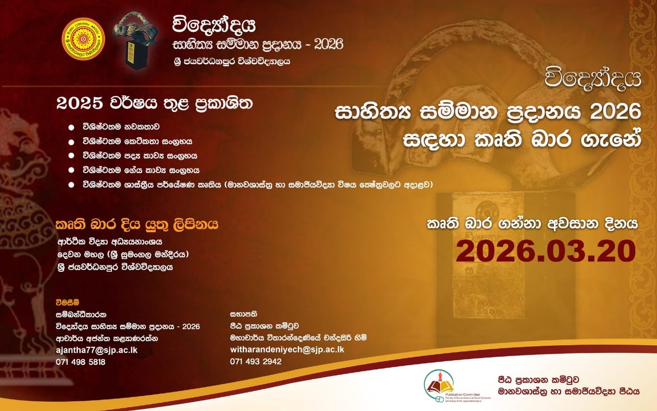 උණුසුම් පුවත්කාලීනසාහිත්යය හා කලාව 2026 විද්යෝදය සාහිත්ය සම්මාන සඳහා නිර්මාණ කෘති භාර ගැනීම ඇරඹේ 2026-03-030 කෘති භාර ගන්නා අවසන් දිනය මාර්තු 20 Share on Facebook Share Share on TwitterTweet Share on LinkedIn Share Post navigation Previous Article වියරණ සතුට Next Article ආරණ්ය කැලේ බහිරව ගල