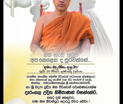 වැඩි විස්තරආදාහන පූජෝත්සවය ඉරිදා (09) අක්මීමන මානවිල .අන්දායම්ගොඩැල්ල . ශ්රී ඛෙත්තාරාම පුරාණ විහාරස්ථානයේ විහාරාධිපති සහ ශ්රී විද්යා ප්රදීප පරිවේණධ්යක්ෂක