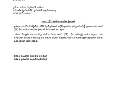 වැඩි විස්තරජාතික කොඩිය අඩ කුඹ කරන්නැයි සෑම රජයේ කාර්යාලයකට ම රජය නිවේදනය කරයි ඉරාන ජනාධිපතිවරයාගේ අභාවය හේතුවෙන් හෙට ශෝක දිනයක් ලෙස ප්රකාශයට පත් කෙරේ. සෑම රජය
