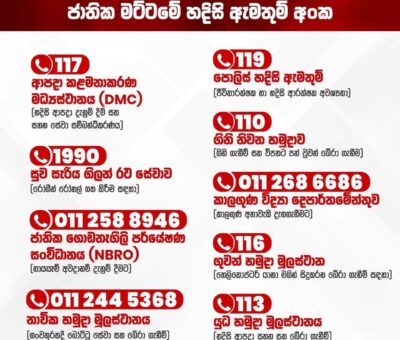 වැඩි විස්තරසහන සඳහා ක්ෂණික ඇමතුම් ඇවැසි නම් මේ දුරකතන අංකවලට අමතන්න මේ වන විට අධිකව කඩා වැටෙන වැස්ස, සුළඟ හා සුළි කුණාටුවක අනතුරුදායක ස්වභාවය නිසා බරපතල ජාතික