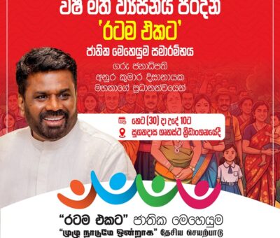 වැඩි විස්තරජනපති අනුර ගේ ප්රධානත්වයෙන් අද දවසේ මෙරට මුහුණ දී සිටින ජාතික ව්යසනයක් වන විෂ මත්ද්රව්ය උවදුර තුරන් කිරීම ඉලක්ක කර ගත් ජාතික වැඩසටහනක් ක්රිය